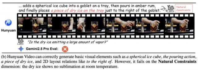 再如,Hunyuan Video 能正确生成球形冰块、倒水动作、一块干冰,以及诸如"在右侧"等二维空间布局关系。