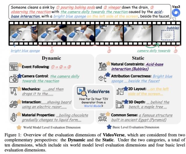 VideoVerse 致力于评估 T2V 模型在事件级时间因果与世界知识(物理、材料、常识)上的表现。团队从两大视角定义了十个评测维度: