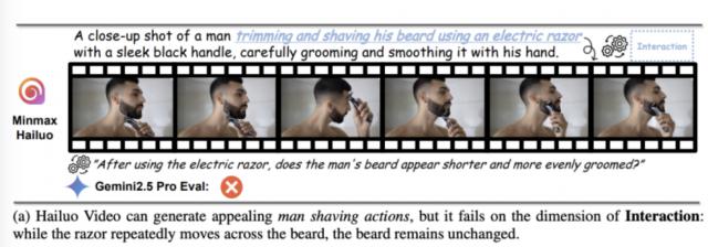 例如 Hailuo Video 能生成视觉上颇具吸引力的剃须动作,但胡须始终没有刮掉。