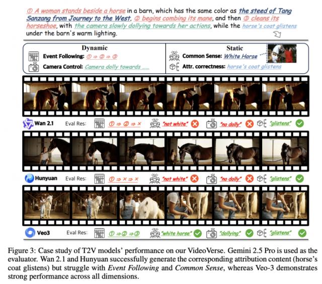 研究发现,Wan 2.1和Hunyuan能成功生成相应的描述性内容(如"马的皮毛闪闪发光"),但在事件连贯性(Event Following)和常识理解(Common Sense)方面表现不佳。