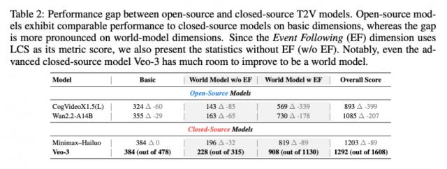 1、开源模型在基础维度(属性、2D/3D 布局等)与闭源模型接近,但在世界模型级别(自然约束、常识、事件因果)差距明显。